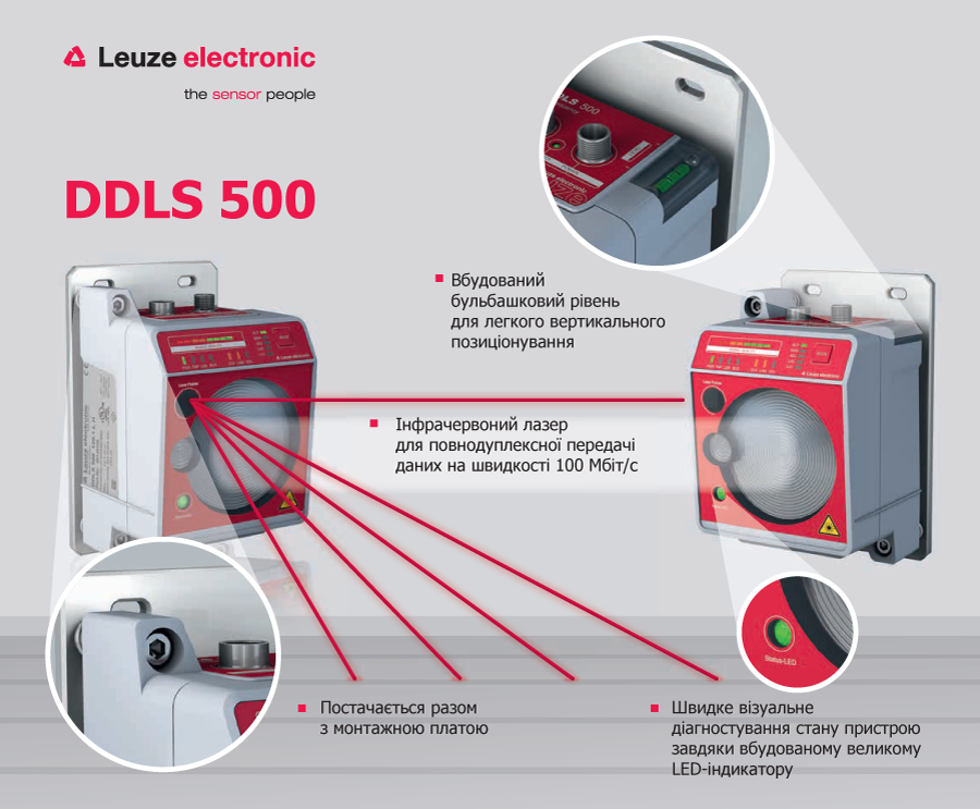 В промисловості або логістичному господарстві зустрічаються ситуації, коли необхідно передавати дані від рухомих чи віддалених об’єктів. Часто в таких випадках використання в якості каналу зв’язку фізичних кабелів є економічно необґрунтованим або взагалі неможливим. З метою вирішення таких задач, німецькою компанією Leuze electronic була розроблена Оптична система передачі даних серії DDLS 500.